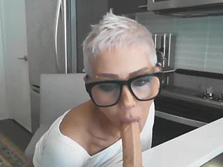 Milf mit großen Titten und großer Brille luscht den Dildo vor der Webcam